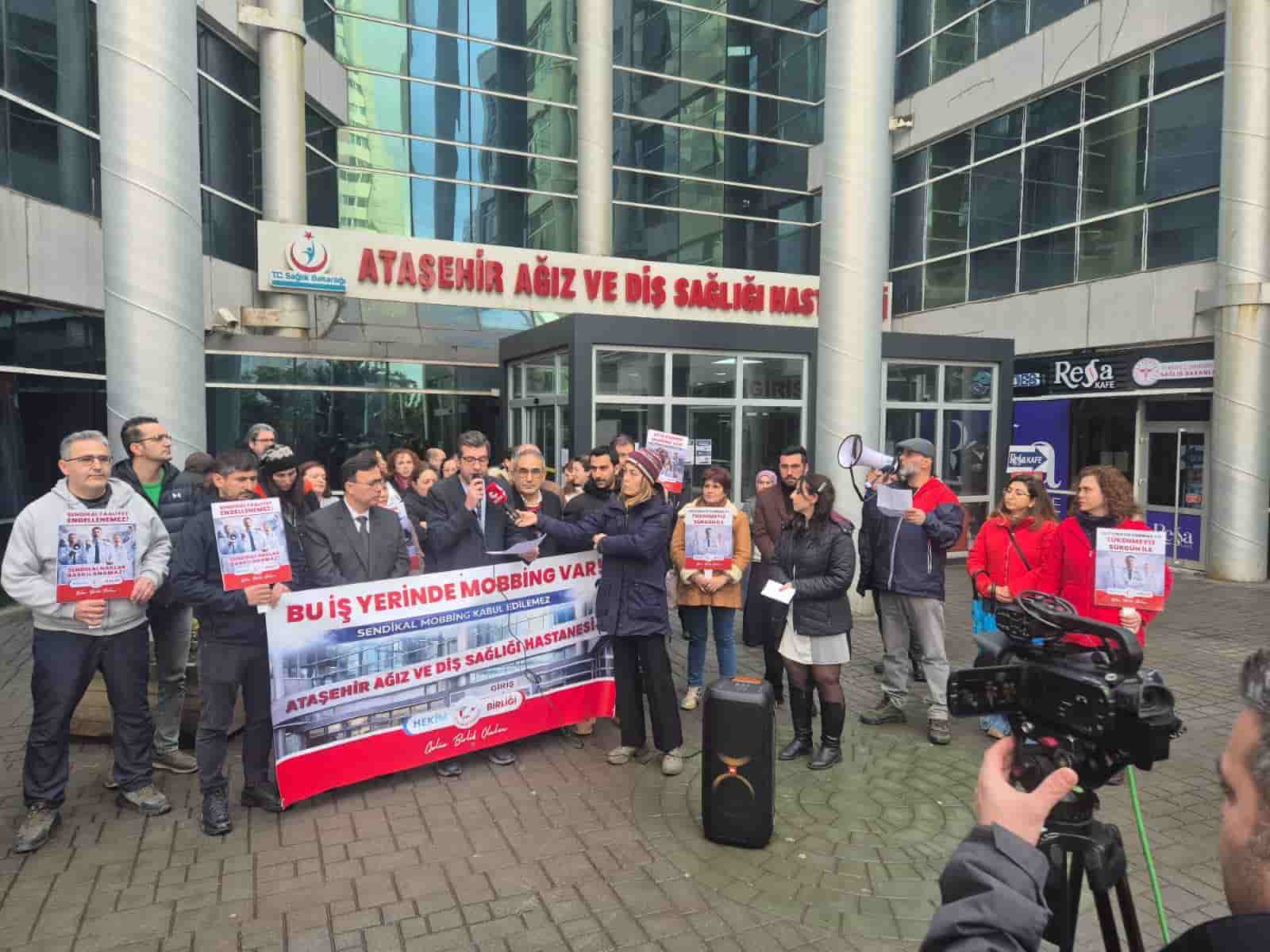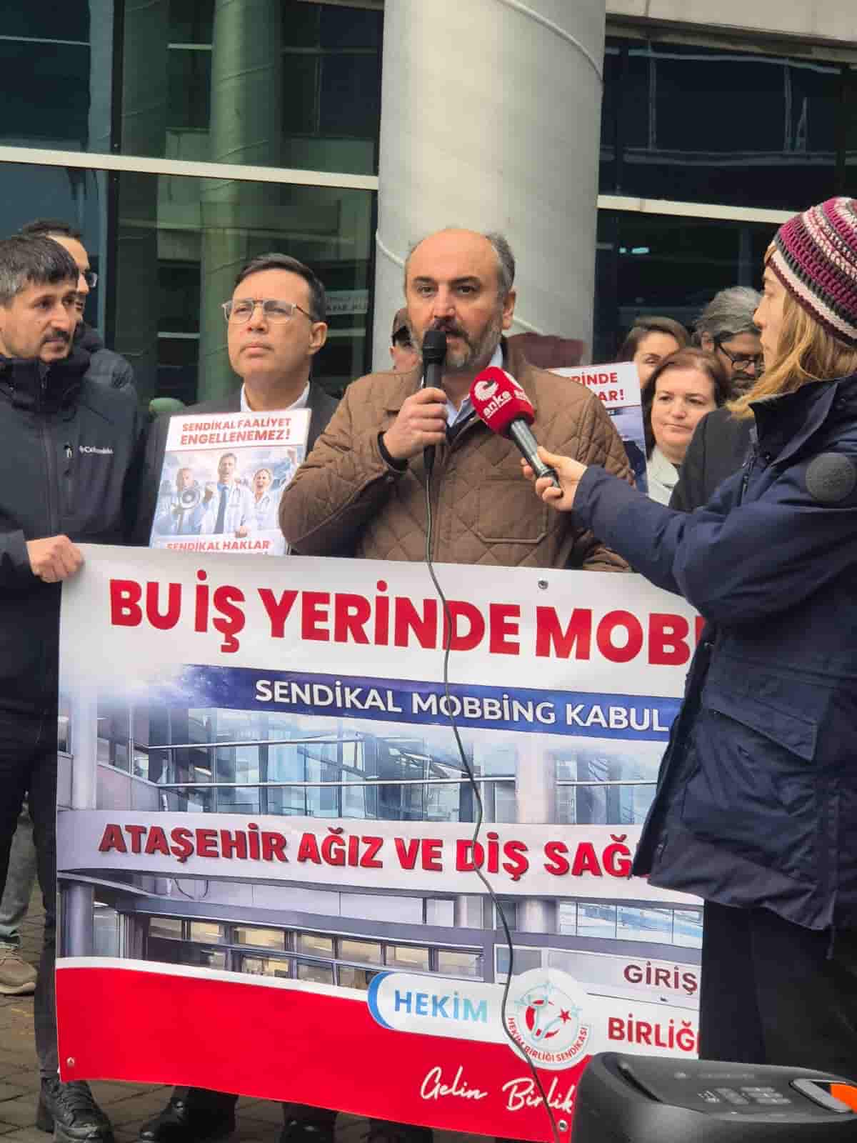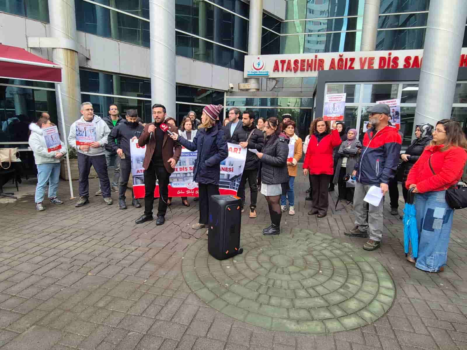 İstanbul Ataşehir Ağız ve Diş Sağlığı Hastanesi önünde düzenlenen basın açıklamasına sıhhat iş kolundaki sendikalar, Hekim Birliği Genel Lider Yardımcısı Op. Dr. Çağlar Yıldırım ve Tabip Birliği İstanbul Şube Yönetimi’nin katılımıyla gerçekleşti. Hekim Birliği yöneticileri tarafından yapılan açıklamada şu tabirlere yer verildi, “Bugün burada; emeğiyle, liyakatiyle ve onuruyla vazife yapan tabiplerin, sistematik bir baskı ve yıldırma siyasetiyle karşı karşıya kalmasına “DUR” demek için toplandık. Hekim Birliği İstanbul Şube Yönetim Kurulu üyemiz Dt. Janat Düzgün, son periyotta arkası gerisi kesilmeyen, hiçbir türel desteği olmayan mesnetsiz soruşturmaların ve nihayetinde “cezalandırma” hedefi taşıyan yöntemsiz bir tayin kararının amacı olmuştur”